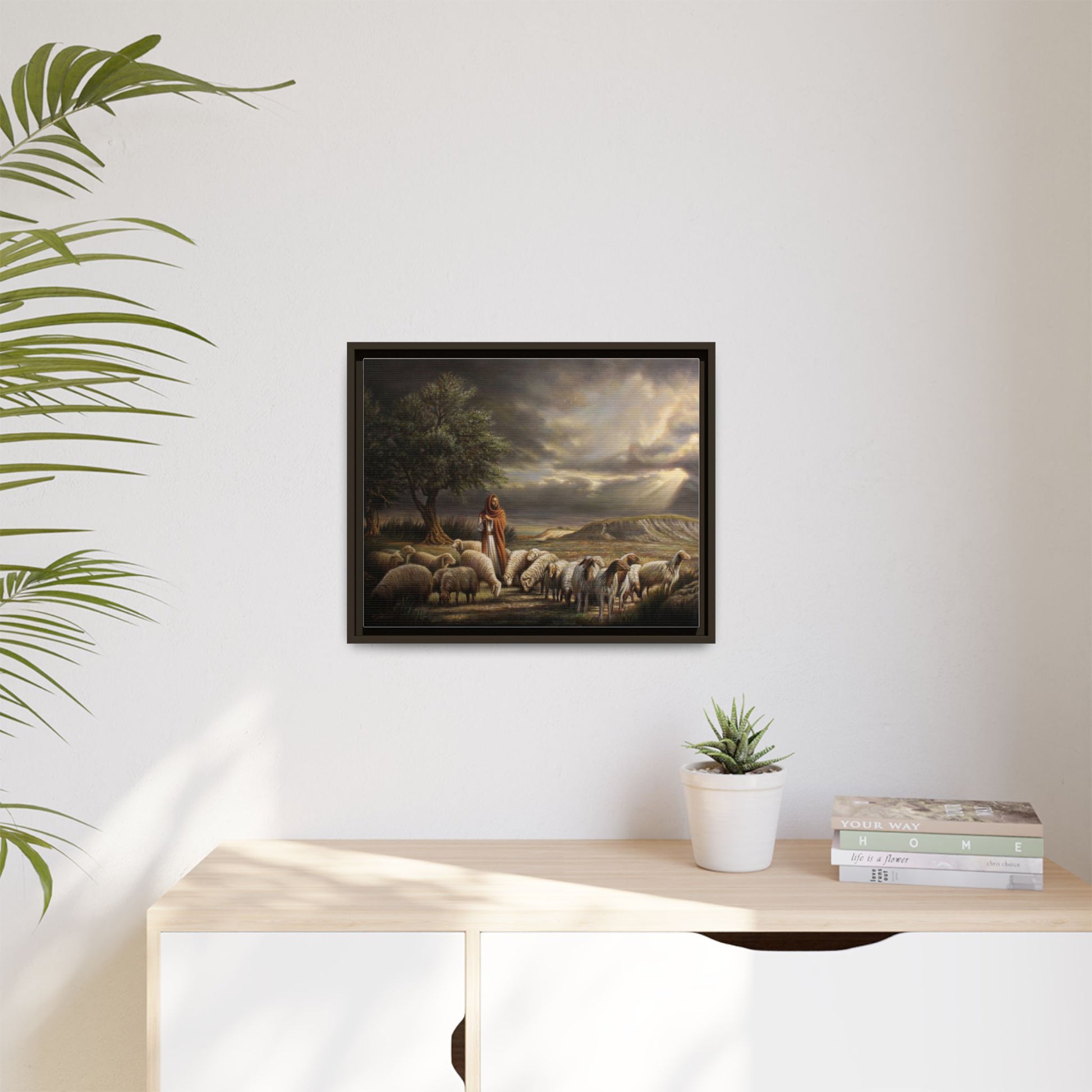 Bring a quiet, reflective moment into your home with this matte canvas print framed in rich pine. The scene — a gentle shepherd tending a flock beneath a brooding sky — feels like a pause in time. Soft, muted tones and painterly brushwork draw the eye inward; the dark frame grounds the piece, giving it a chapel-like presence on the wall. Hang it in a reading nook, entryway, or living room to create a calm corner for contemplation and conversation. The tactile matte finish reduces glare and highlights the subtle color shifts in the sky and landscape, while the solid wood frame adds warmth and presence to traditional or rustic decor.